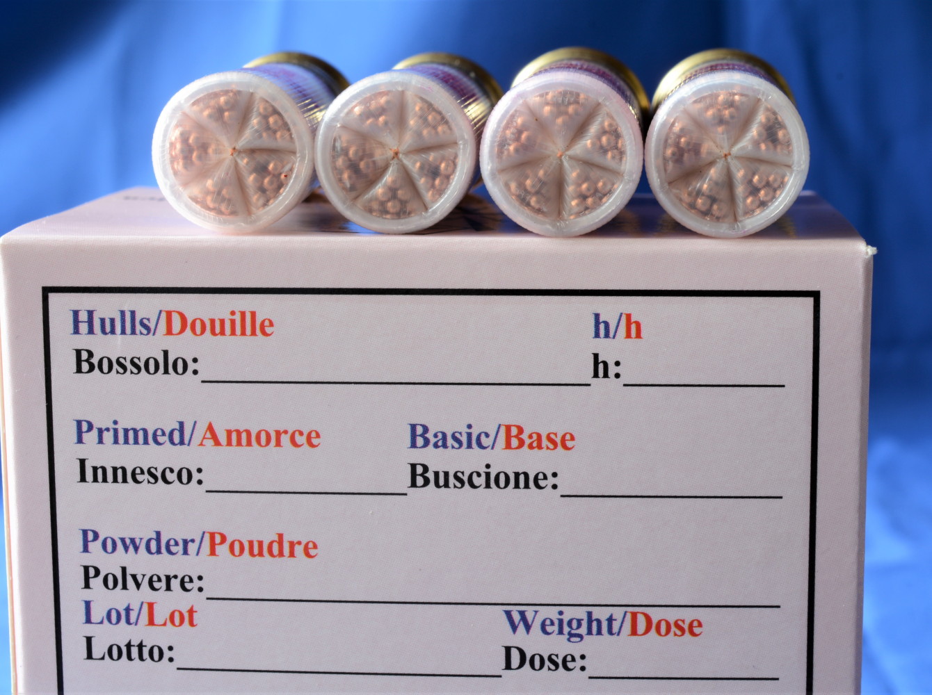 Come propellente abbiamo scelto un grande classico che stiamo ampiamente utilizzando in questi ultimi anni: l’Anigrina lamellare, polvere prodotta e commercializzata da Baschieri & Pellagri sin dal 1930 in forma di nitrocellulosa modificata color mattone-vinaccia.