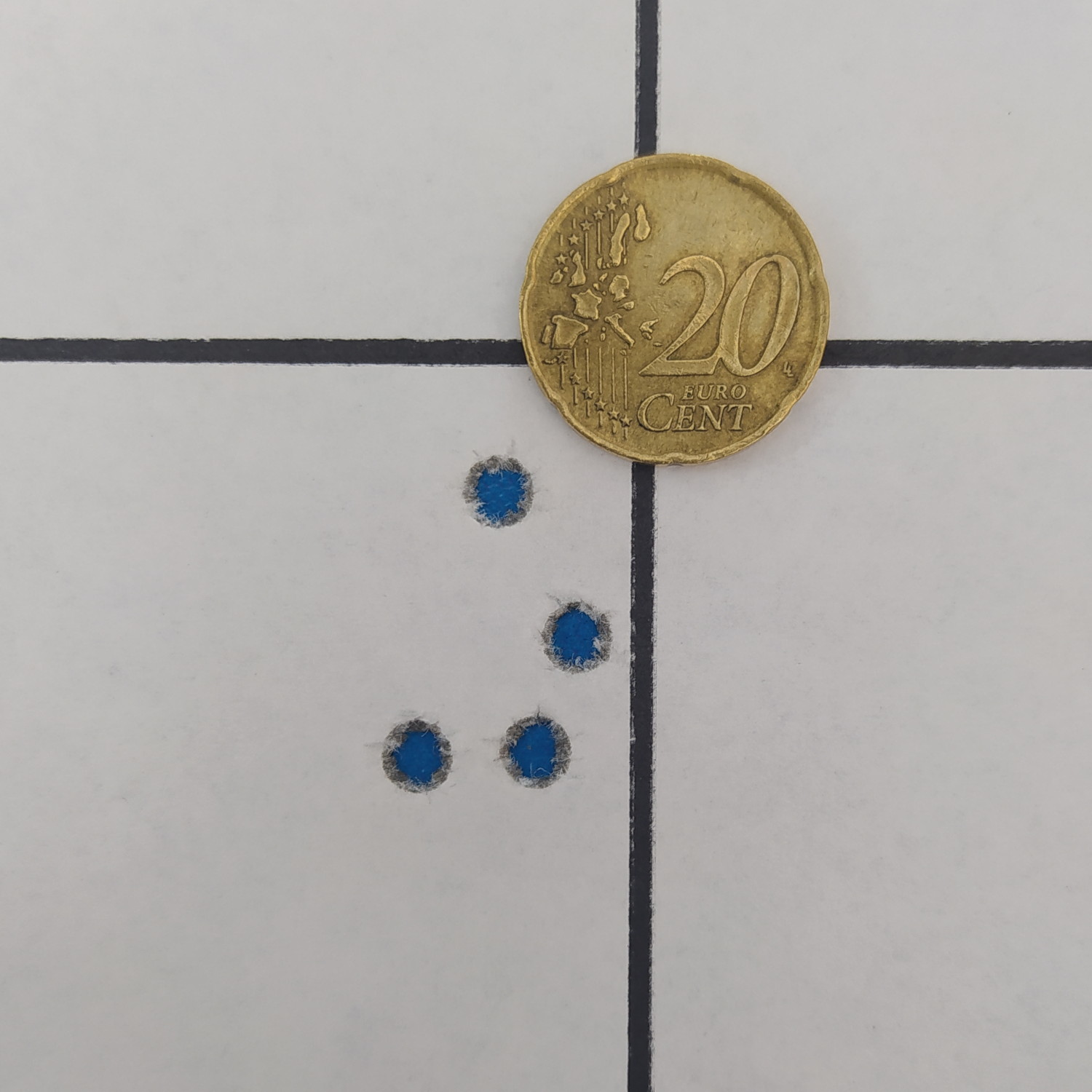 I quattro proiettili Sierra Smp hanno consentito di ottenere una rosata di 20 millimetri, considerando la distanza fra i centri dei due fori più lontani. In vista dell’impiego venatorio, si è preferito spingere al massimo la cartuccia sfruttando tutto il potenziale disponibile dal punto di vista della cessione energetica sul selvatico. Tuttavia, operando minime riduzioni alla carica, sarà possibile stringere ulteriormente la rosata già ampiamente contenuta nel Moa.