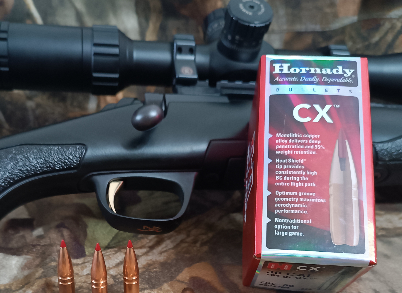 L’offerta in calibro .30” è certamente quella più nutrita, e si articola nelle palle di 110, 150, 165, 180 e 190 grani. La Hornady Cx in prova (codice produttore #304704) pesa 165 grani (corrispondenti a 10,69 grammi). Per le sue caratteristiche, questa monolitica è adatta a cacciare quasi ogni specie di ungulati: il catalogo del produttore suggerisce medium e large game.