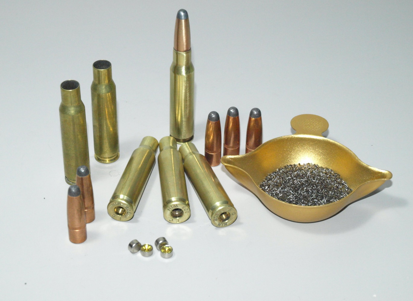 Ho utilizzato bossoli a marchio Federal, provenienti da diversi cicli di sparo. Prima del riutilizzo li ho ricalibrati in full size die della Hornady, rettificati nella lunghezza per eliminare il materiale eccedente dal colletto, quindi riportati all’originaria lunghezza di 51,00 millimetri esatti. La lucidatura in vibropulitore a graniglia e la pulizia delle sedi d’innesco dai residui degli spari precedenti hanno permesso il completo ripristino dei bossoli. Sono di produzione statunitense anche gli inneschi alloggiati nei bossoli Federal: nello specifico si tratta degli apparecchi Cci 200 del tipo large rifle standard.