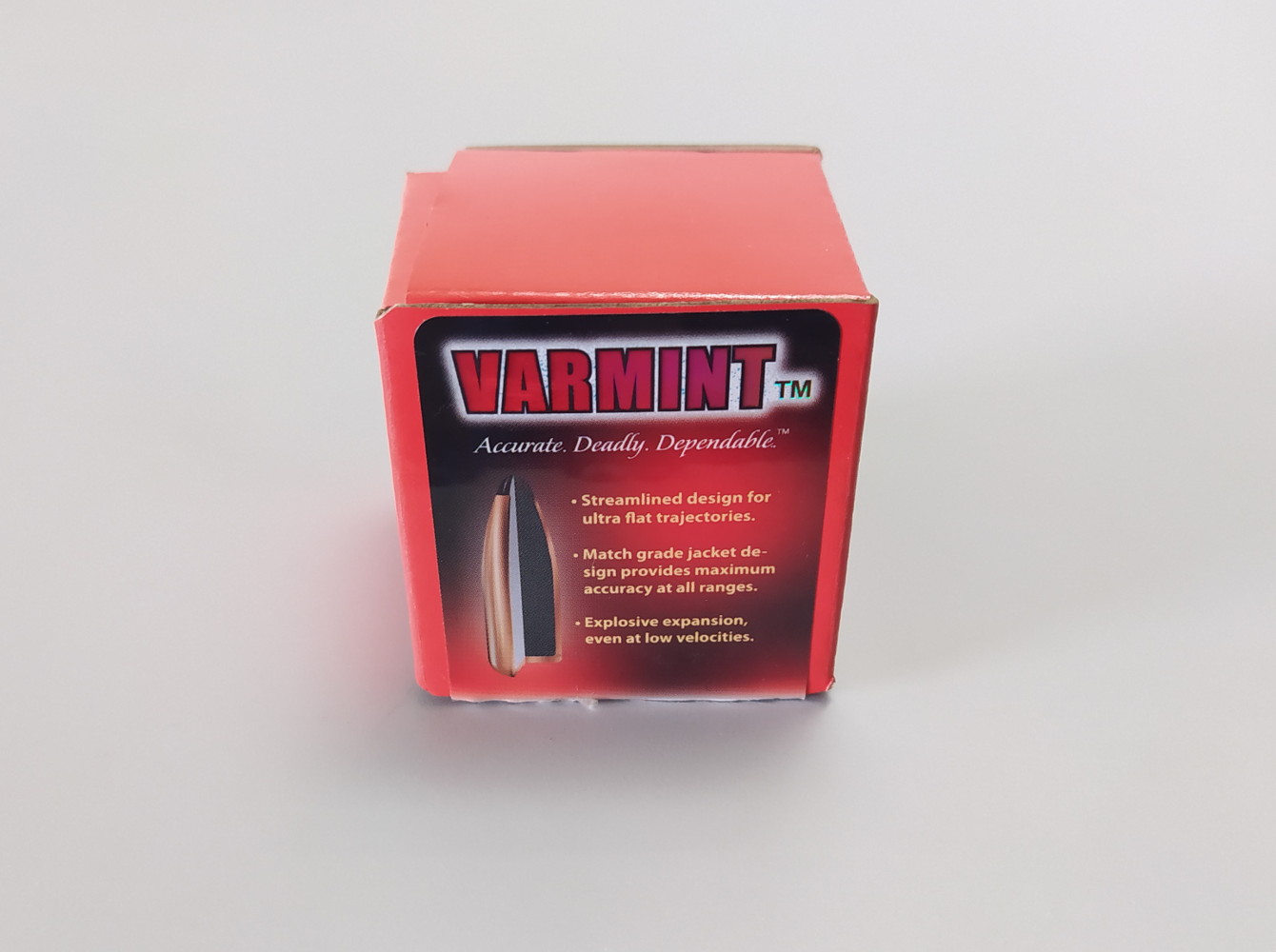 I proiettili utilizzati nelle ricariche (codice produttore #2270) hanno densità sezionale di .171 e coefficiente balistico di .264 in G1. La linea Varmint in calibro .224” comprende pesi di 45 grani (in particolare destinati al calibro .22 Hornet), 50 grani, 55 grani e 60 grani: offre quindi una sufficiente forbice di scelta per l’adattamento a diversi passi di rigatura. Sul campione di dieci palle esaminate (60,19; 60,16; 60,19; 60,23; 60,22; 60,22; 60,18; 60,26; 60,18; 60,23 grani) s’è ottenuto un peso medio calcolato in 60,2 grani con una deviazione standard di 0,029 grani.