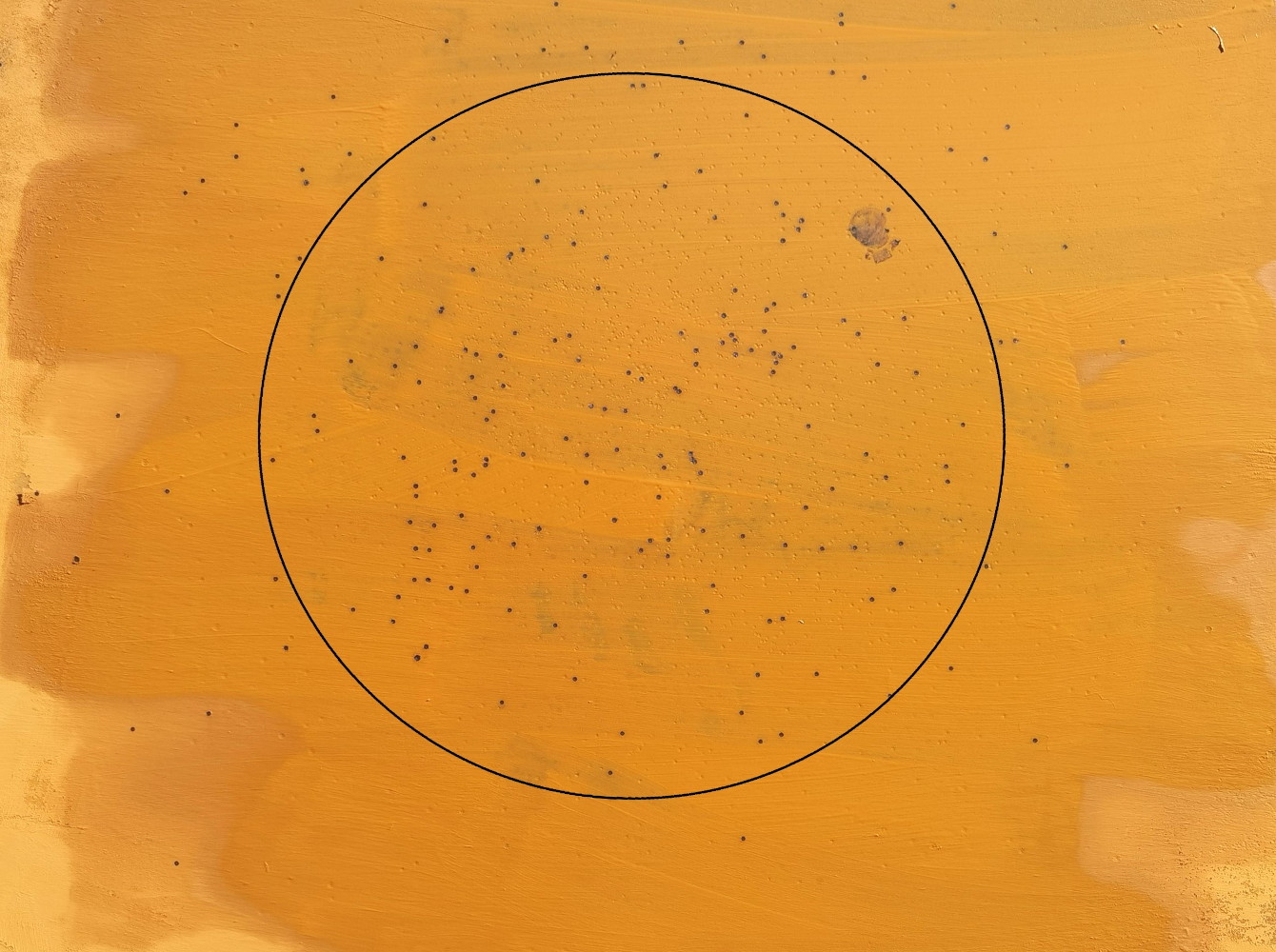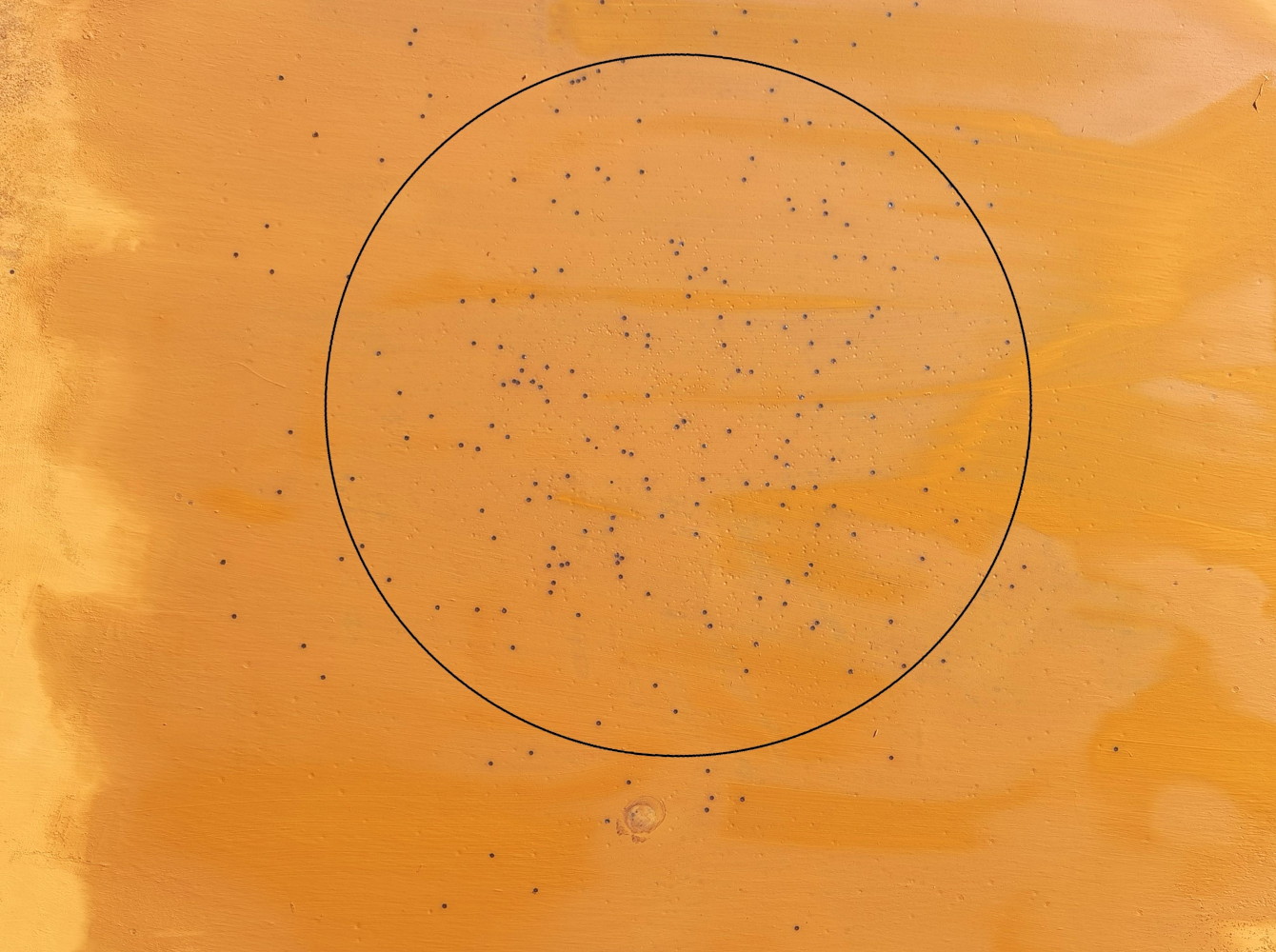 Ho sparato la cartuccia in placca sulle pedane del Tav Pisa; ho sparato a 25 metri con un fucile semiautomatico Benelli Raffaello Comfort calibro 12, munito di canne lunghe 700 millimetri e strozzatore interno-esterno Gemini *** (20 millimetri esterni). Sono poi passato allo strozzatore ** Gemini Performer in titanio, prima a 30 e poi a 35 metri.