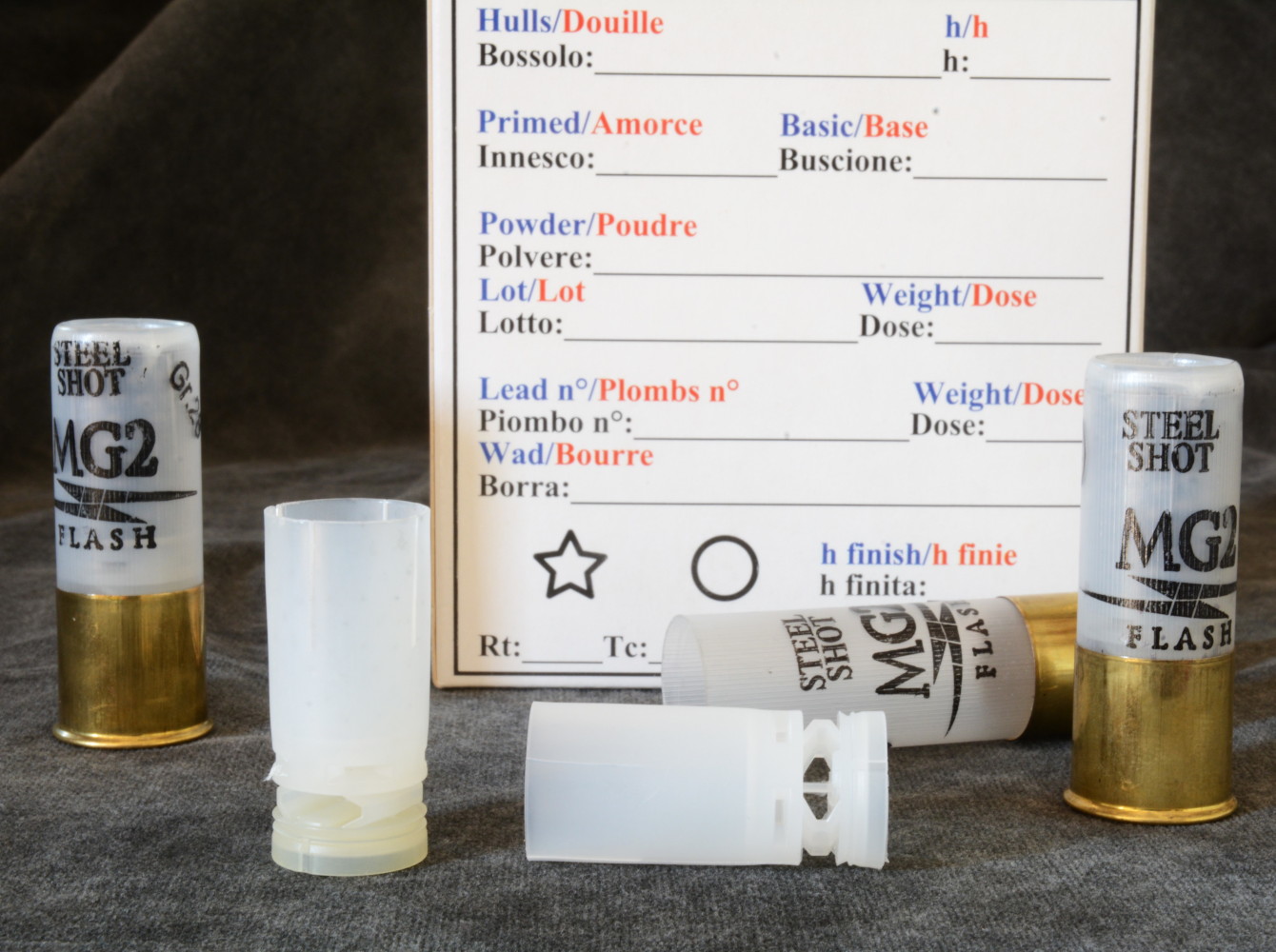 Abbiamo poi scelto un bossolo trasparente Fiocchi tipo 4 alto 70 millimetri (fondello ottonato alto 22 millimetri). Ci abbiamo apposto alcune scritte: la scritta Mg2 Flash, per indicare la polvere e la velocità elevata dell’assetto; la scritta Steel shot a rimarcare il caricamento green; la grammatura utilizzata per il pallino e la sua numerazione. Le scritte sono apposte con vernice di colore nera: abbiamo utilizzato una stampante e inchiostro Omv, che ben si staglia sul colore trasparente del bossolo.