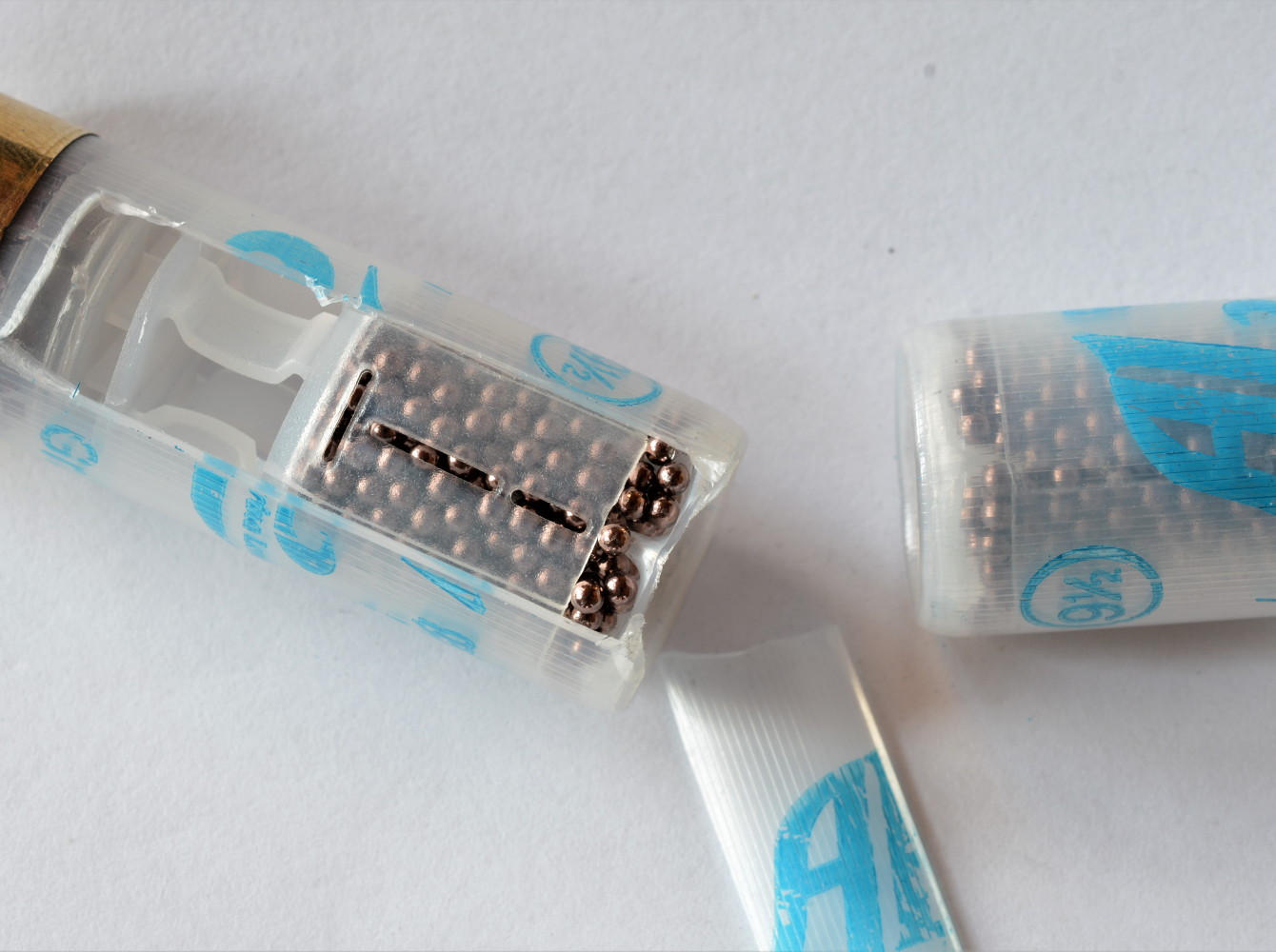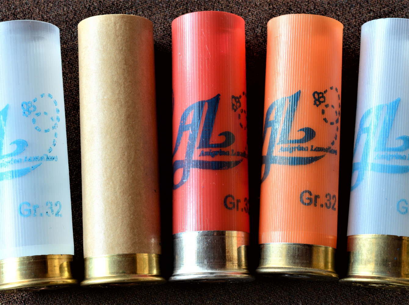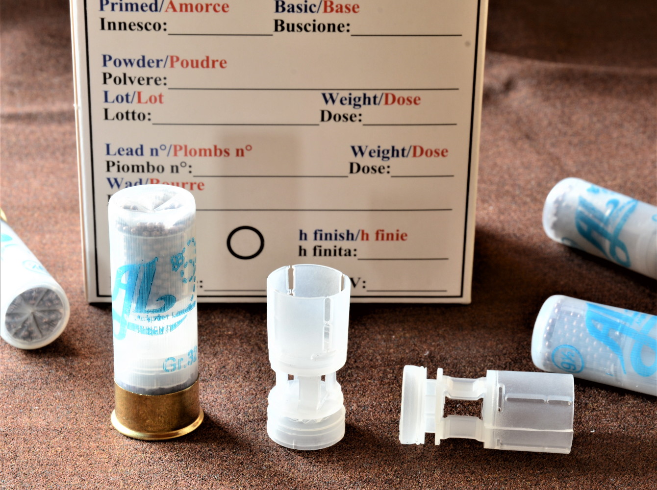 Per la stampa (stampante Omv, inchiostro Rocchini) ci siamo sbizzarriti. Ne diamo evidenza mostrandovi non soltanto il bossolo standard che abbiamo allestito ma anche altri di colori diversi con stampe differenti (trasparenti, arancioni, rossi e di cartone, sia tipo 1 con fondello ottonato da 8 mm, sia tipo 2 con fondello ottonato da 12 millimetri); in azzurro abbiamo apposto la scritta Al Anigrina lamellare, poi la grammatura della cartuccia e la numerazione del piombo utilizzato. L’insieme ci appare sobrio, elegante e caratterizzante.