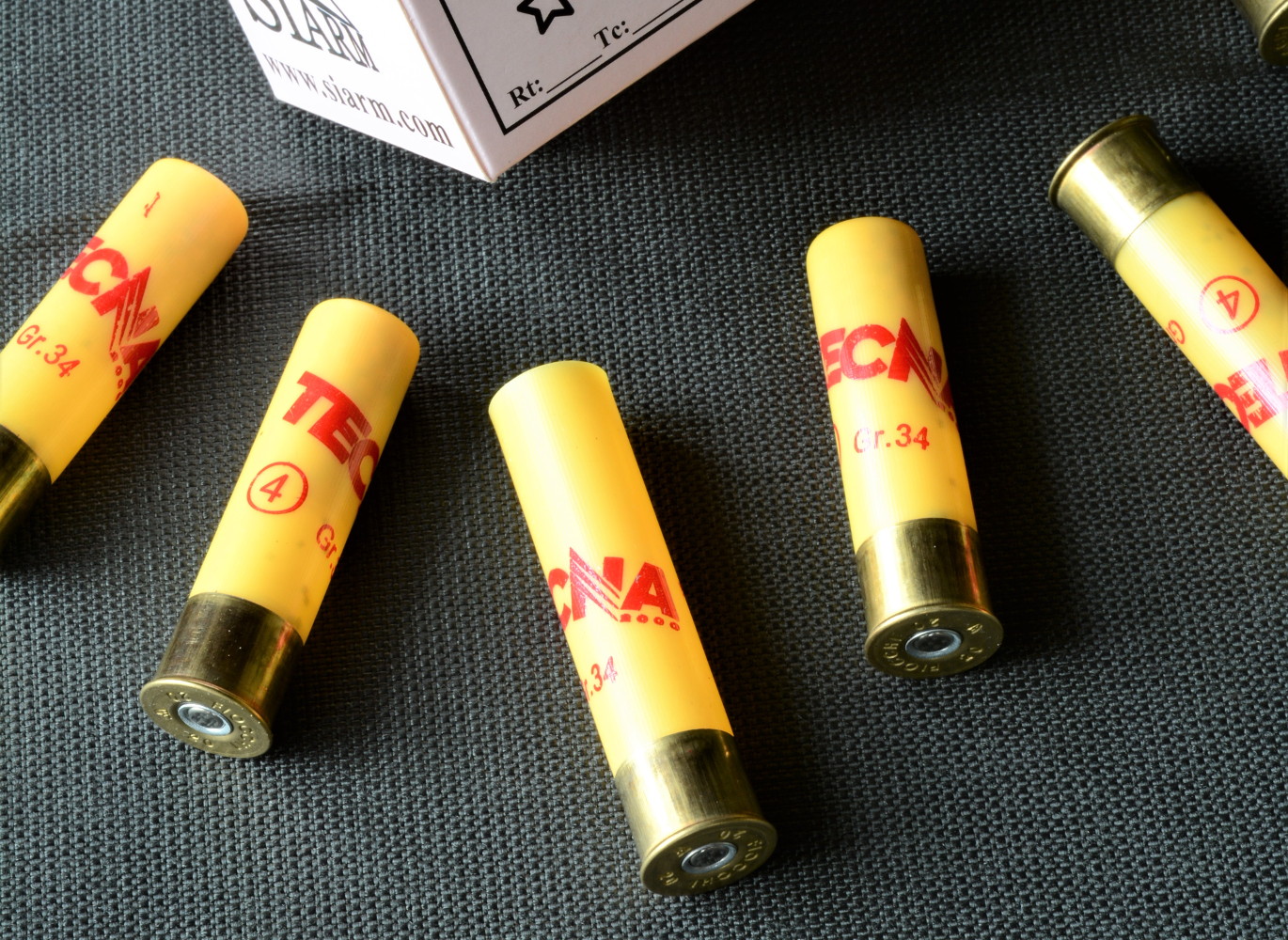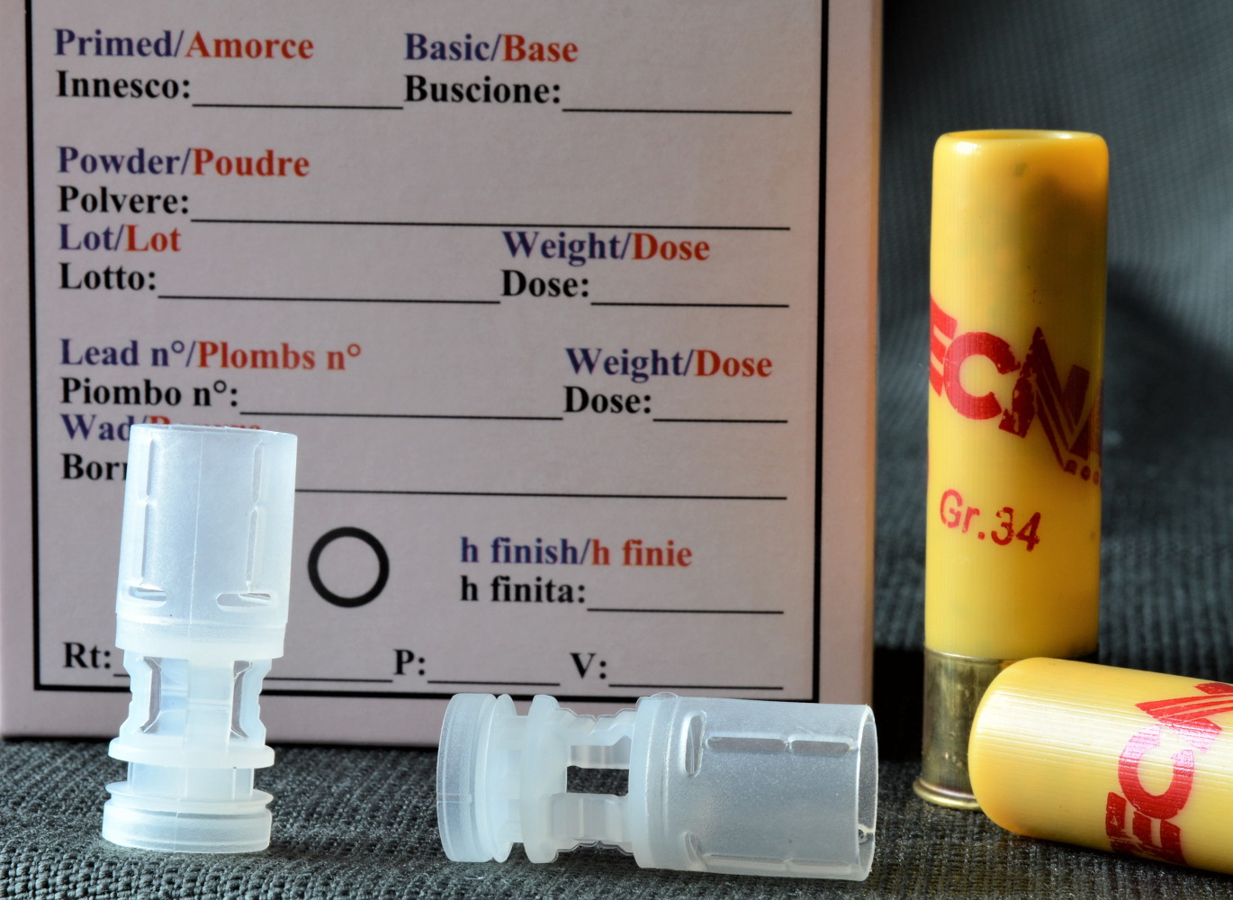 Come bossolo, ovviamente magnum, abbiamo scelto un Fiocchi da 76 millimetri di altezza, rigorosamente di colore giallo; il giallo è il colore che l’Unione europea impone ai produttori di cartucce per il calibro cadetto, onde evitare che accidentalmente si verifichi l’introduzione di un bossolo calibro 20 nella camera di scoppio di un calibro 12, causandone la potenziale esplosione. Sul bossolo (stampante Omv, inchiostro Rocchini) abbiamo apposto pochissime scritte con vernice rossa; nello specifico, abbiamo indicato soltanto la polvere utilizzata (scritta in diagonale), la grammatura e la numerazione del piombo.