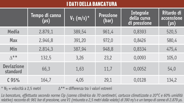 Si ottengono una pressione corretta (è comunque una cartuccia HP, da sparare in fucili che abbiano superato la prova superiore del Banco di Prova) e un tempo di canna leggermente lungo, tipico di una carica magnum e indice di un’ottima progressività. Il tempo di canna, spesso colpevolmente trascurato, è in realtà un indice importantissimo che evidenzia l’equilibrio complessivo di un assetto.