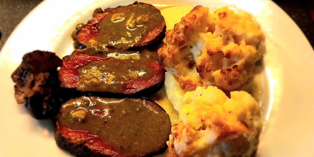 Ricavate dalla lombata intera dei medaglioni con un taglio leggermente obliquo, impiattate con il cavolfiore e condite la carne con il pesto e sale grosso a piacere.
