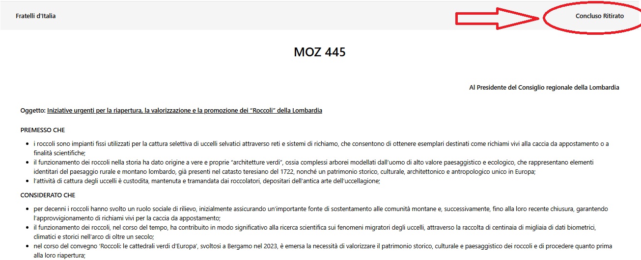 Non è equivocabile la nota che accompagna l’intestazione: poche ore dopo averla presentata, il gruppo consiliare di Fratelli d’Italia ha ritirato la mozione con la quale chiedeva alla giunta Fontana d’attivarsi per promuovere la riapertura dei roccoli in Lombardia.