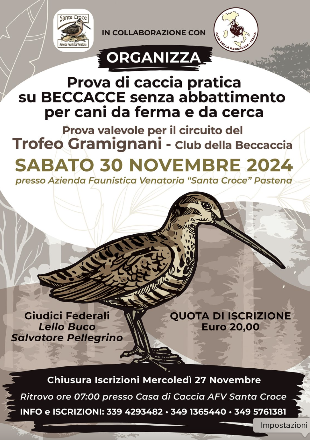 A seguito di quella che si è svolta a ottobre in Estonia, la prima prova italiana del circuito valido per l’assegnazione del Trofeo Gramignani – Club della Beccaccia ha avuto luogo il 30 novembre nei terreni dell’azienda faunistico-venatoria Santa Croce a Pastena (Frosinone).