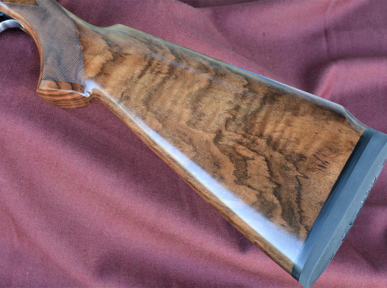 L’astina è tonda e completa bene l’estetica curvilinea dell’intero sovrapposto. Lo sgancio dell’astina è affidato a un comando a pompa, azionabile tramite un piccolo pulsante in apice, parzialmente incassato e dotato di una serie di piccoli cerchi in rilievo che facilitano il contatto con la falange del dito. In un’apposita losanga lignea laserata sulla faccia ventrale, la faccia ventrale dell’astina ospita un inserto metallico, inciso anch’esso. Una nota di merito va inoltre al calciolo: si tratta infatti di un Kick-eez (made in Usa) che è risultato semplicemente eccellente, grazie alla sua costruzione in Sorbothane (polimero uretanico viscoelastico sintetico utilizzato come ammortizzatore e smorzatore di vibrazioni), un materiale che combina proprietà della gomma, del silicone e di altri polimeri elastici, utilizzato anche dalla Nasa. L’incassatura è estremamente curata in tutti i punti visibili; l’attenzione per i dettagli la si percepisce anche nei punti nascosti, quali l’interno dell’astina.