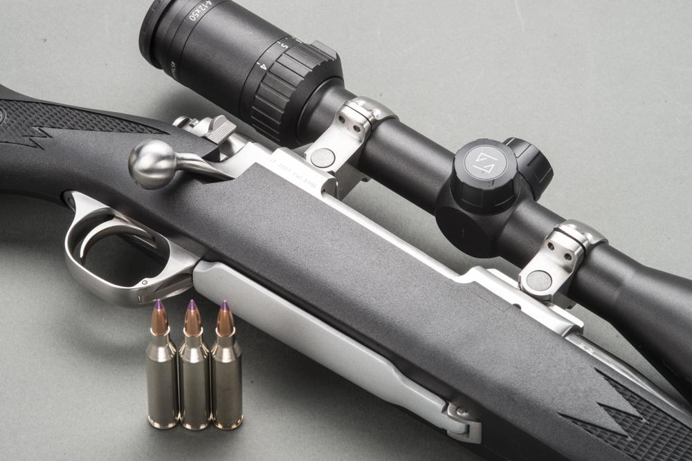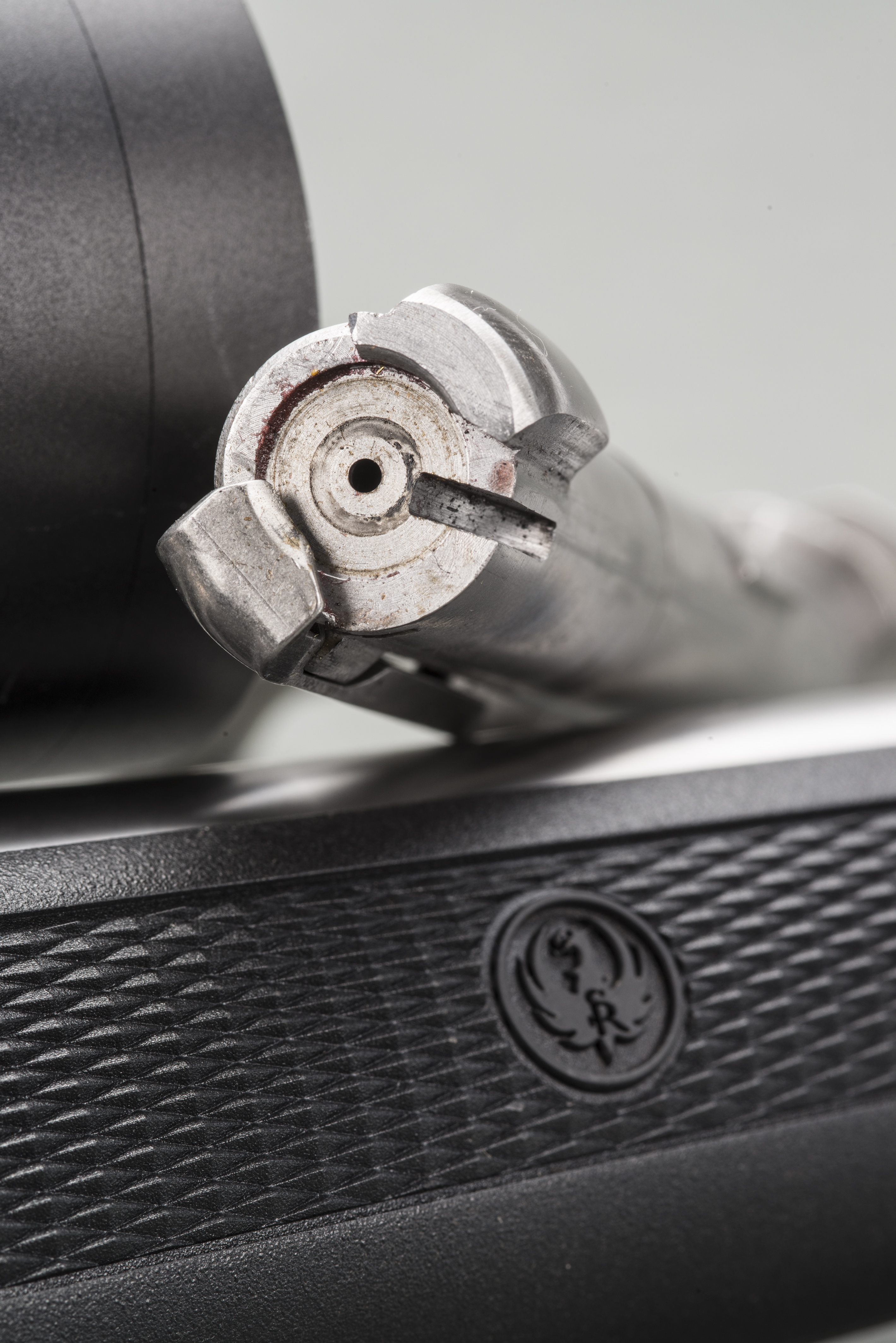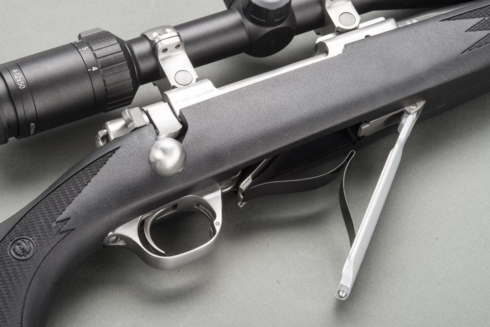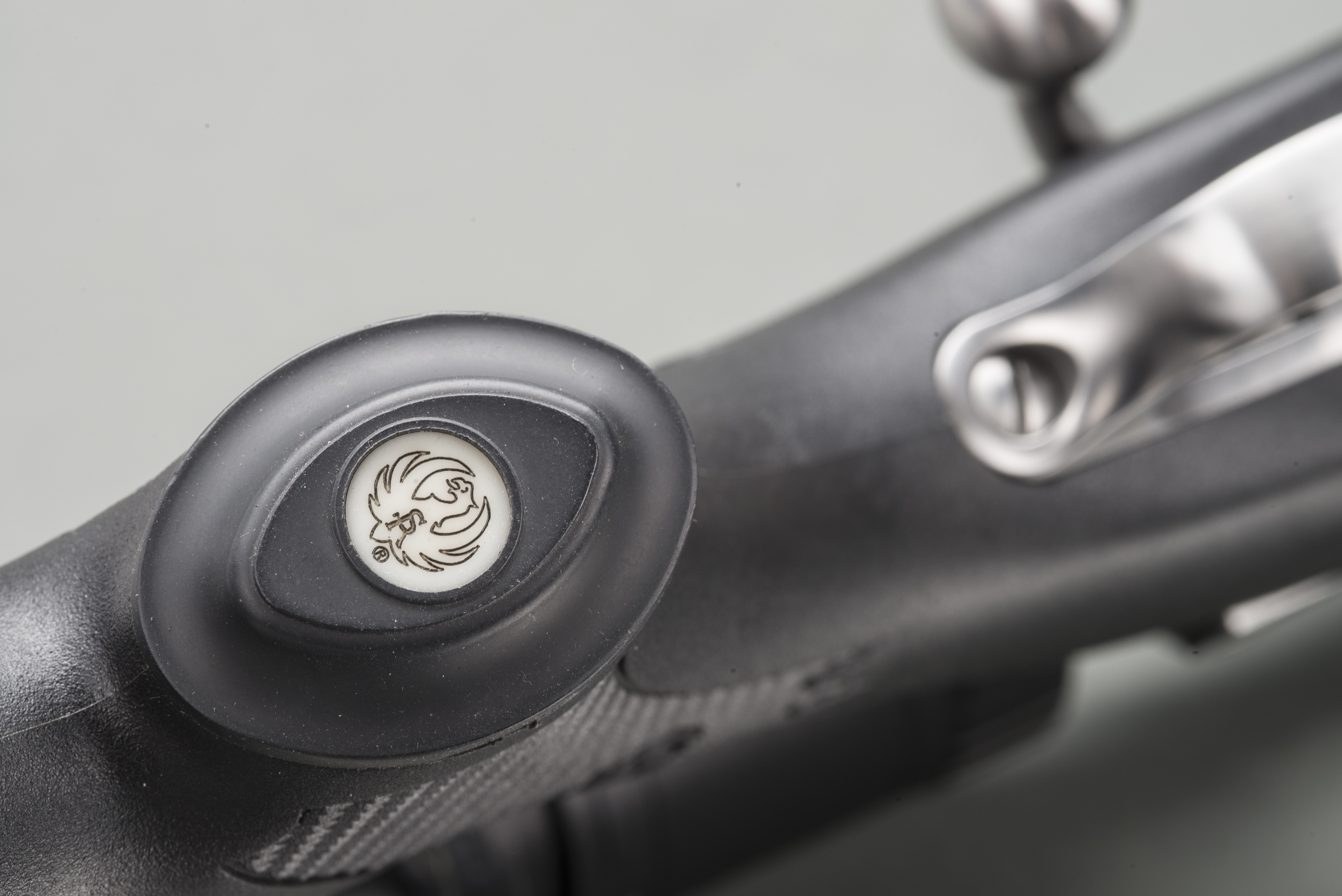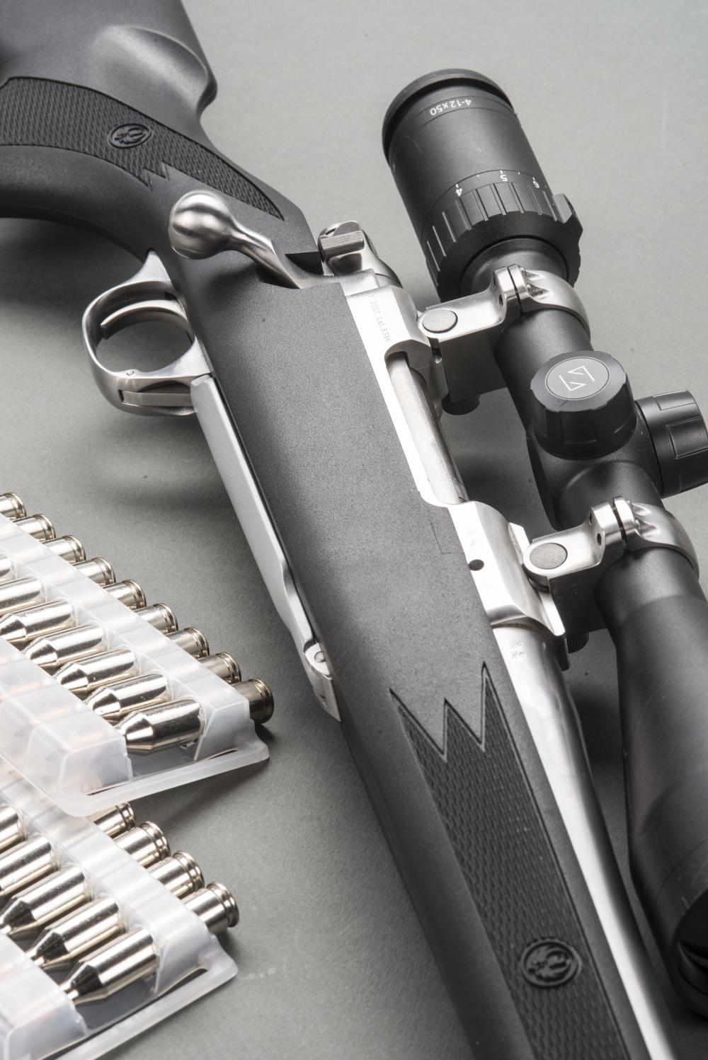 Nonostante che richieda uno sforzo dichiarato di circa 5 libbre (2.250 grammi), al nostro test ha spuntato un peso di circa 1.750 grammi. Sull’azione è ricavata una slitta da mezzo pollice con gli svasi tipici Ruger che hanno la funzione di garantire un accoppiamento particolarmente saldo tra il castello e le basi degli attacchi. A questo proposito, giova segnalare che gli attacchi del produttore sono costituiti da un insieme composto da una base e una metà anello superiore. Nella parte inferiore della base di ciascun anello c’è un rampone, collocato fuori dall’asse di simmetria rispetto alla parte anteriore e posteriore dell’anello. L’alimentazione è resa possibile da un serbatoio apribile all’interno del quale trovano alloggio 4 cartucce; il funzionamento è garantito da una molla a lamina a W che agisce sulla piastra elevatrice.
