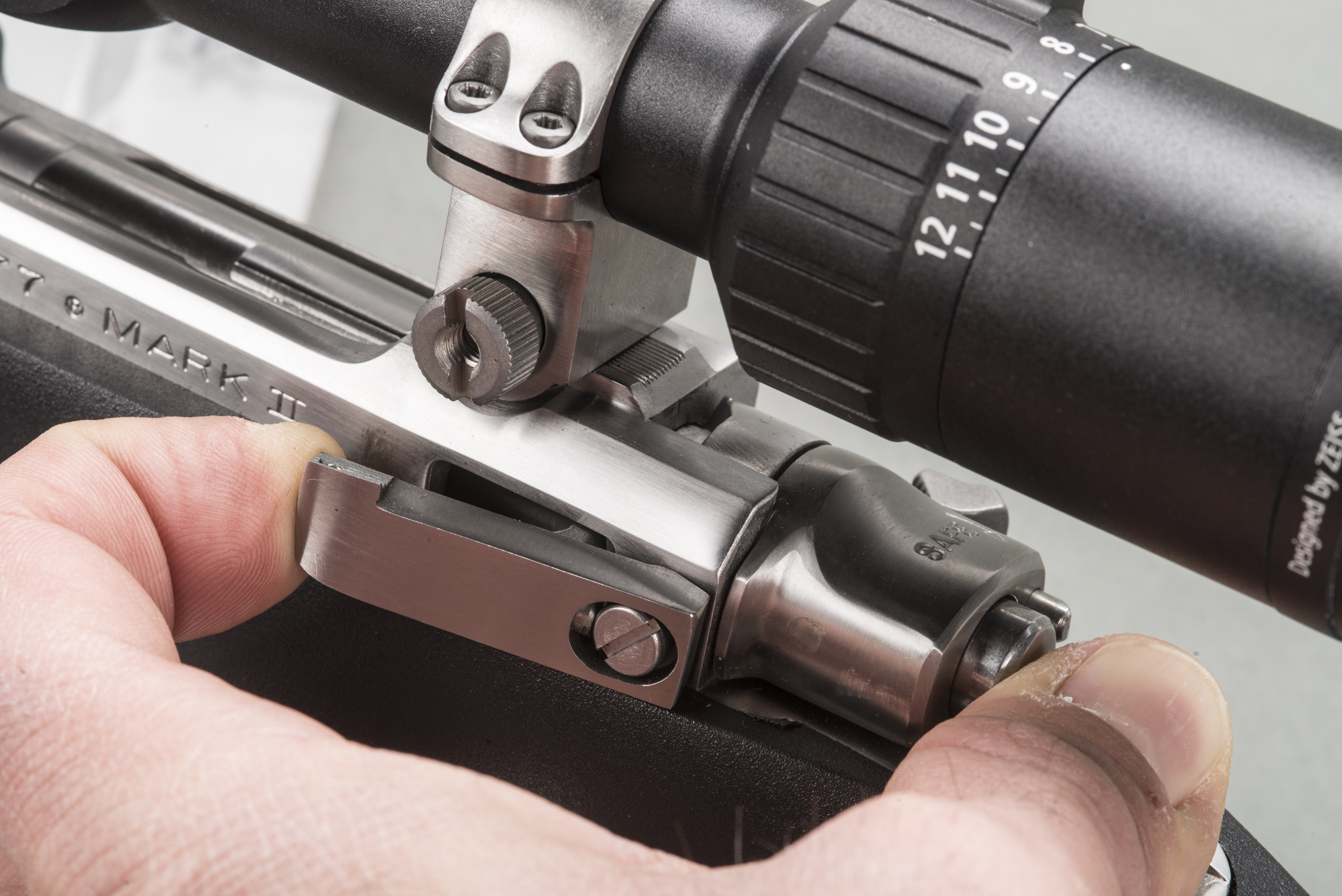 Rinnovati erano pure il sistema di sicurezza a due posizioni e lo scatto. Nella sua vita operativa, il modello M77 ha subito una serie di modifiche; una minore, che riguarda il sistema di montaggio delle basi per l’ottica, e alcune più corpose nel 1991 che hanno portato alla definizione della versione contrassegnata dalla sigla Mark II. La nuova arma, attualmente in produzione e venduta come M77 Hawkeye, vanta un nuovo otturatore, una nuova sicura a 3 posizioni e un nuovo scatto, oggetto di una successiva ulteriore modifica. L’otturatore, ora aperto nella sezione superiore, permette l’alimentazione controllata; la sicura a 3 posizioni ne consente l’apertura anche in posizione di sicurezza; lo scatto non è più regolabile ma tarato in fabbrica su un peso dichiarato di 5 libbre.