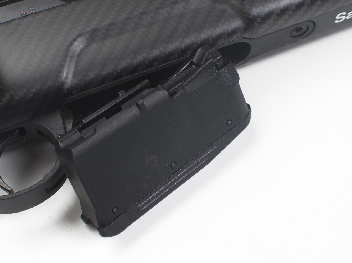Il caricatore è minimale, trattenuto da un dente fisso nella parte anteriore e da una leva a bilanciere in quella posteriore. Calibri short e long sfruttano la medesima azione, quindi il caricatore ha le stesse dimensioni; soltanto che nei calibri short, come il .308 Winchester, è presente un blocchetto polimerico nella parte posteriore per colmare il vuoto e garantire una corretta alimentazione. Camero la prima cartuccia, inserisco la sicura e ci incamminiamo.