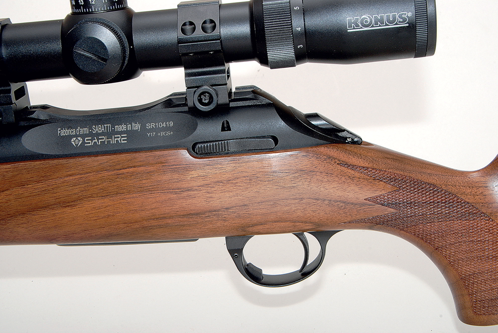 Sono ben tre le calciature con cui è possibile ottenere la Saphire: la prima ha linee classiche ed è realizzata in un duro materiale sintetico, poi c’è l’innovativa thumbhole, con impugnatura dritta e ampio foro per il passaggio della mano, realizzata sempre con lo stesso materiale, e infine la calciatura più elegante, realizzata in legni di grado elevato e che ricalca le linee della prima. L’arma ricevuta per la prova è proprio vestita con la calciatura in legno, legno come detto ben figurato e ottimamente lavorato, con un accoppiamento alla meccanica realizzato alla perfezione. Fini zigrini presenti sulla pistola e sui fianchi dell’astina rendono salda la presa e anche punti critici, come sotto il poggiaguancia e l’accoppiamento con il sottile calciolo in gomma, sono privi di qualsivoglia pecca; unico appunto è relativo alla presenza delle magliette snodate per la cinghia, identiche a quelle che si trovano sulle armi a canna liscia e con asole di ridotta ampiezza, peraltro facilmente sostituibili. Merita notare che la forma della calciatura si è dimostrata adatta e comoda sia per l’uso da appoggio sia da imbracciata. Quella in legno e in sintetico hanno la stessa identica forma e la differenza di prezzo è intorno ai 250 euro: la prima è molto pregevole e rende la Saphire in grado di tener testa alle carabine mitteleuropee di grande marca, quella in sintetico regge sicuramente meglio gli strapazzi di una caccia rude. Come precisone, queste carabine sono a tutti gli effetti delle Sabatti, ossia vere macchine da tiro, anche con le sottili canne di questi allestimenti venatori. Per testare le qualità della Saphire abbiamo esploso numerosi colpi di vario tipo, ingaggiando bersagli posti a cento metri e tirando informalmente a lattine e gong fino ai trecento: la rosata allegata, ottenuta con le Fiocchi Exacta da 168, sicuramente non da caccia ma ottima pietra di paragone, è indicativa da cosa possa dare la rigatura Mrr. In definitiva, la Sabatti ha oggi un nuovo asso nella manica: elegante, funzionale, precisa e per di più italiana.