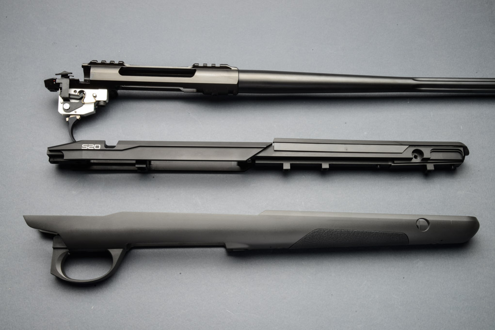 Tornando allo chassis, questo componente fondamentale fornisce un bedding a V su tutta la lunghezza dell’azione, garantendo quindi un contatto totale a garanzia della massima precisione e la migliore dispersione dell’energia prodotta dal rinculo. Il calcio – realizzato in polimero Hir (high impact resistant) – è assicurato al telaio da due viti che agiscono su una piastra di collegamento, così da renderlo sostituibile; essendo removibile fa sì che la S20 sia un’arma takedown. Tale da essere smontata per il trasporto e richiedere una valigetta molto compatta e bilanciata.