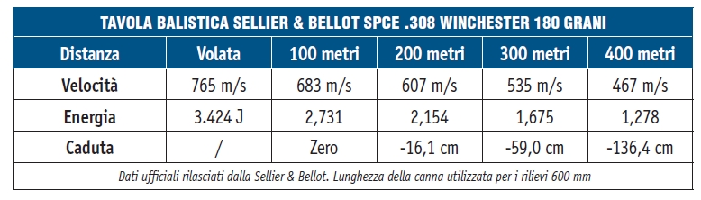 Sellier & Bellot con palla Spce di 180 grani calibro .308 Winchester: la tabella balistica
