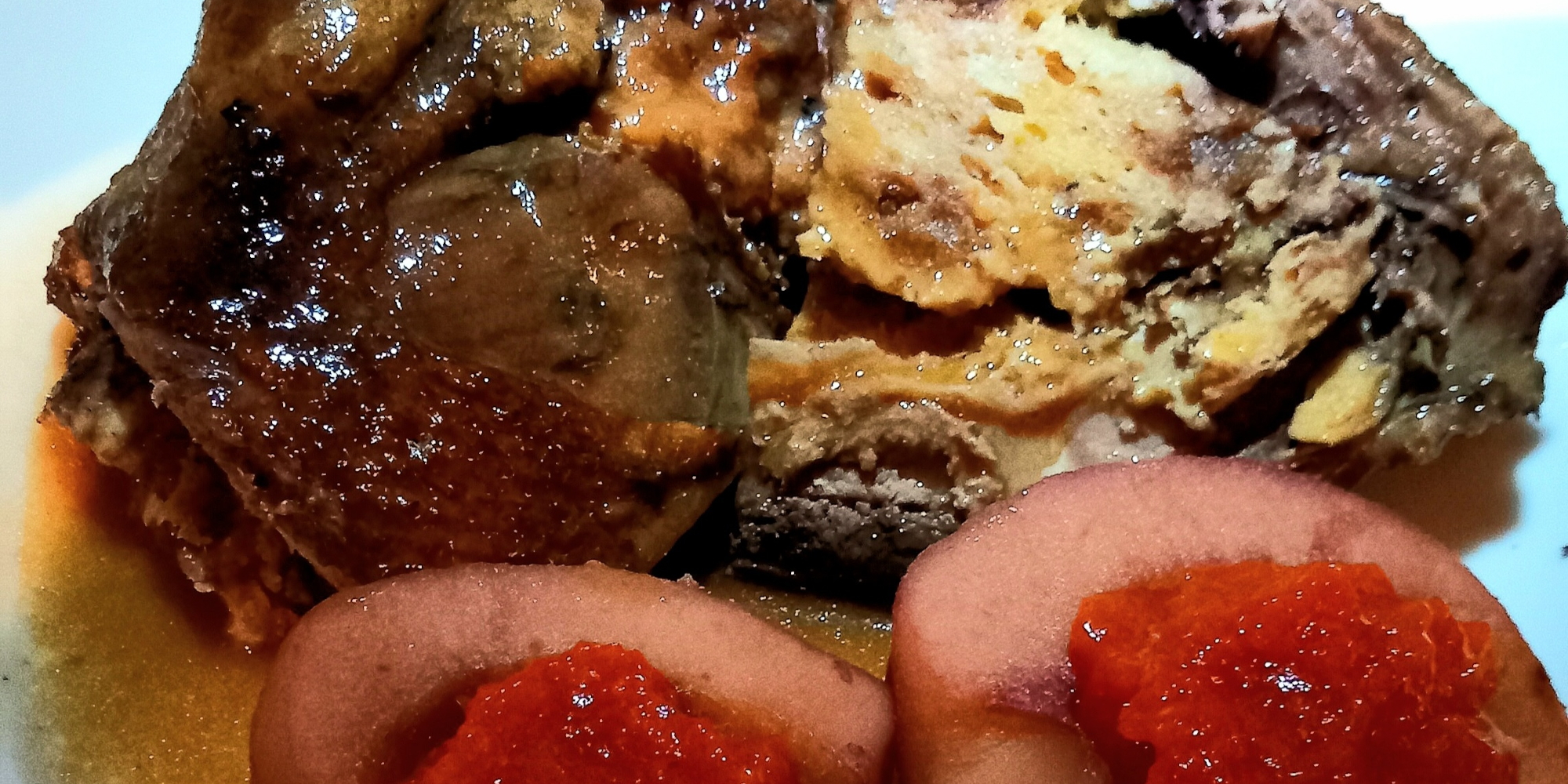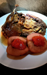 Il pan di zenzero in salsa punch è il cuore del germano reale, che viene servito con le mele cotte nel vino rosso accompagnate dalla marmellata di rosa canina.