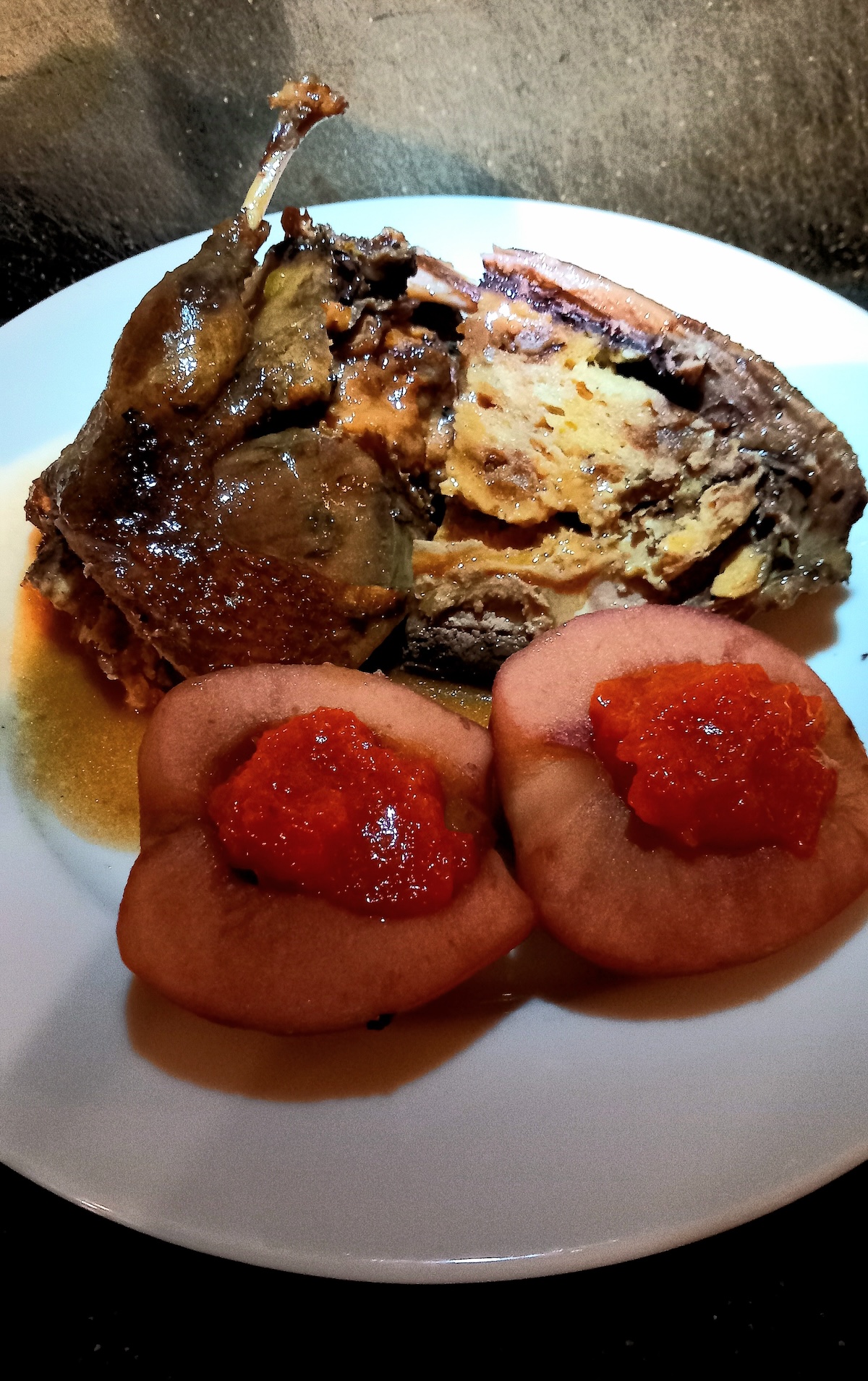 Impiattate metà anatra condendola con il sughetto e accompagnandola con una mela cotta tagliata a metà e farcita con marmellata di rosa canina.