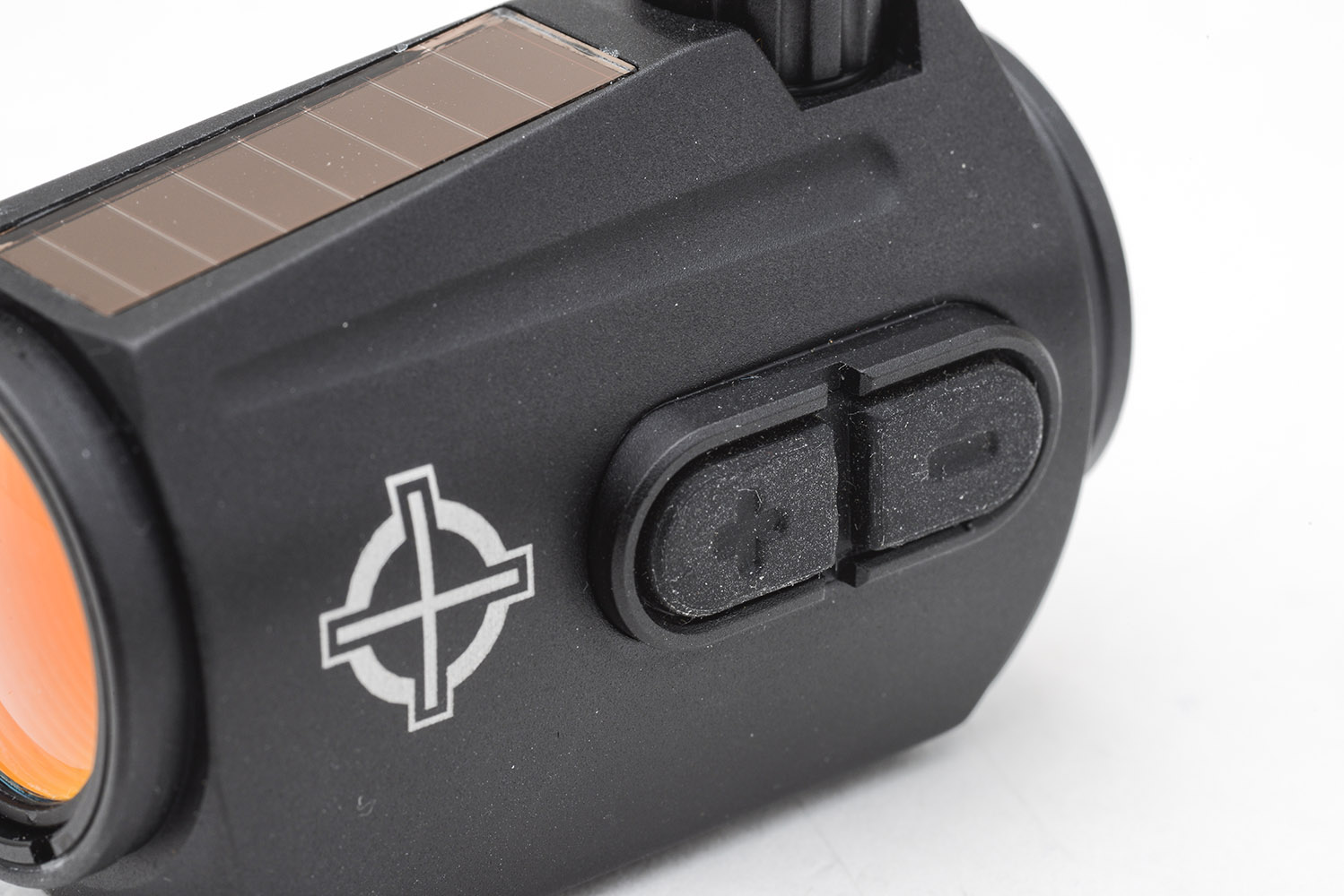 Il funzionamento è reso possibile dalla pressione di due soli pulsanti, gommati, che consentono la regolazione dell’intensità del punto rosso, l’accensione e lo spegnimento dello strumento, il passaggio dall’alimentazione mediante batteria a quella che si affida invece all’energia fornita dal modulo fotovoltaico integrato. Le differenze tra le due fonti di alimentazione sono sostanzialmente due. Anzitutto l’autonomia: teoricamente infinita (a patto che vi sia luce ambiente sufficiente) per la fonte green, limitata a 400 ore alla massima potenza del punto sfruttando l’accumulatore (diventano 200.000 alla potenza minima, il dato è dichiarato dal produttore).