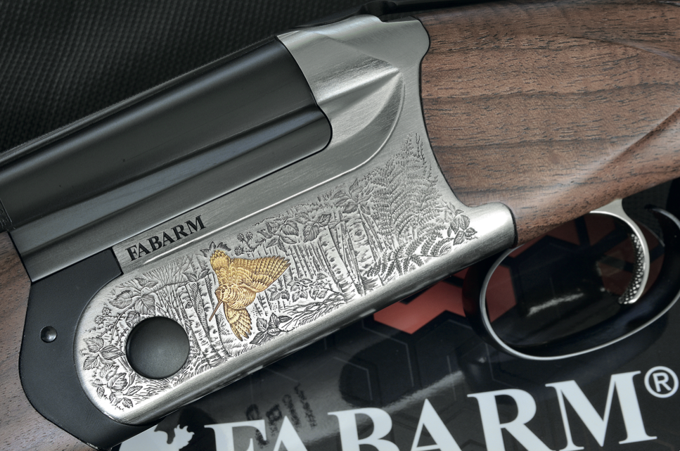 La bascula in Ergal 55 (da cui la sigla AL), larga circa 41 mm nella porzione anteriore, è finita nichelata e dona luce all’arma. Secondo tradizione radicata in Fabarm, è pure incisa, in modo abbastanza elaborato. Riscontriamo, infatti, un’incisione a laser, eseguita dalla Bottega Giovanelli, con scene di caccia attinenti alla destinazione dell’arma. La beccaccia appare ben raffigurata (specialmente quella sul fianco destro) e naturale. Buona anche la definizione dell’incisione, che alterna dei tratteggi a punti in cui il dettaglio si fa più preciso.