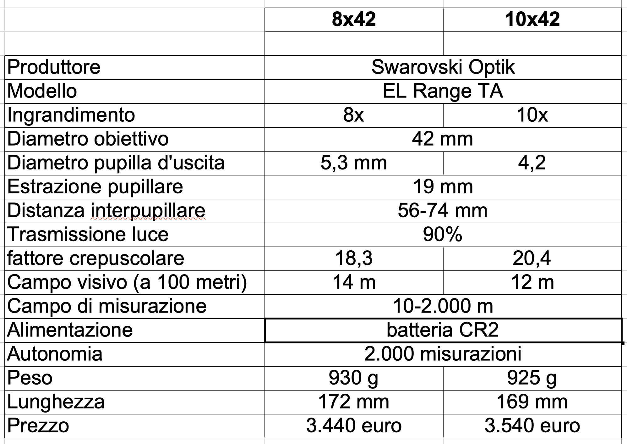La scheda tecnica dello Swarovski EL Range AT 8×42 e della versione a 10 ingrandimenti
