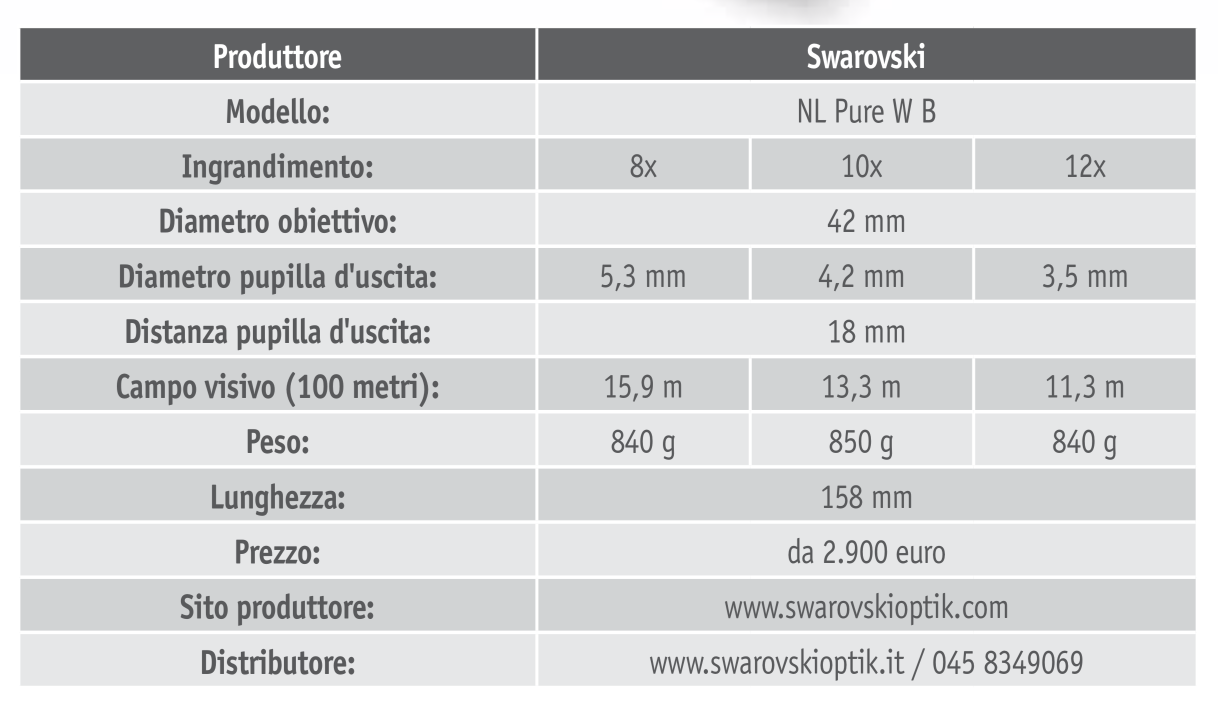 Lo strumento viene offerto in tre allestimenti che differiscono per l’indice degli ingrandimenti, rispettivamente otto, dieci e dodici. Adatti quindi a tutti i tipi di caccia, dall’Appennino (dove da sempre mi spendo a favore di un numero limitato di ingrandimenti) all’impiego in montagna. L’obiettivo è sempre da 42 millimetri per enfatizzare la trasportabilità dello strumento, quindi pesi e ingombri, a prescindere dalla versione prescelta. Tra quelle disponibili non sono previste variazioni di lunghezza né di peso sostanziali.