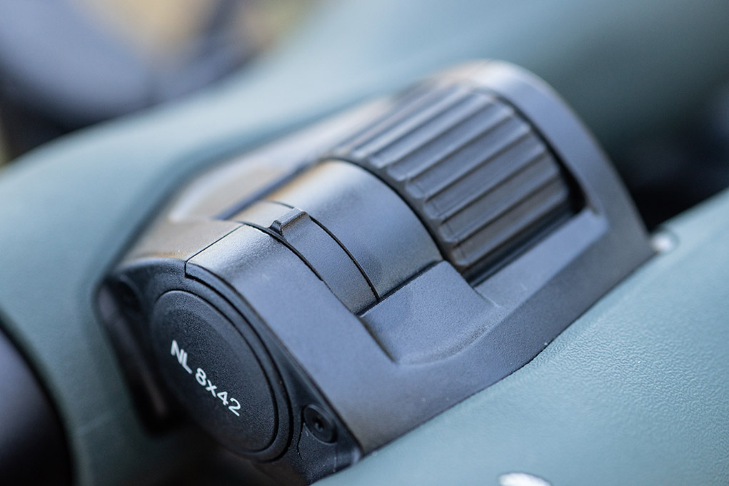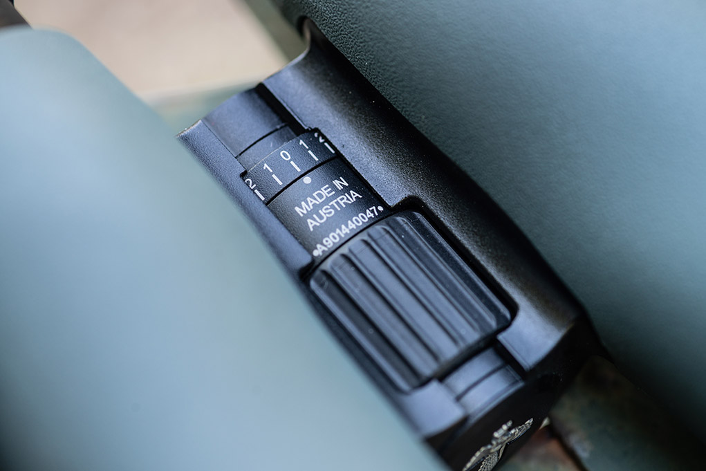 Terzo punto su cui si sono confrontati i progettisti Swarovski è la ghiera della mezza a fuoco, posizionata sul ponte, che guadagna in fluidità e favorisce la migliore focalizzazione sul bersaglio. In posizione coassiale è montata una seconda che agisce sulla correzione diottrica del tubo di destra. L’intervallo di regolazione si estende tra gli estremi di quattro diottrie, sia in positivo sia in negativo, testimoniato da un indicatore posto sotto il ponte. Manca quindi la regolazione diretta sull’oculare, da dove si registra unicamente la posizione della conchiglia in gomma. Dieci le posizioni previste.