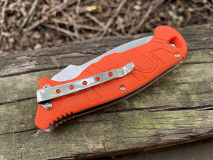 Le guancette in materiale plastico arancione dell’Umarex Elite Force EF141, insieme con la lama in acciaio inossidabile 440A con finitura satinata, lo rendono ben visibile anche quando è quasi buio.