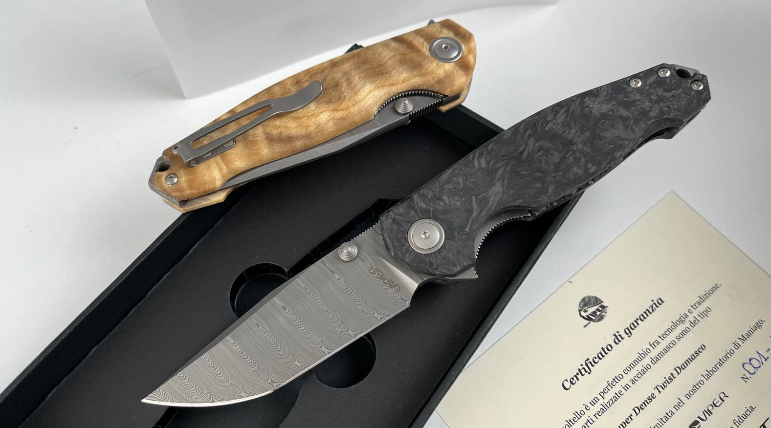 Nei due modelli qui ritratti l’inconfondibile lama dal disegno orientale è realizzata non in Böhler M390 come nei modelli di serie ma in damasco Ssct (Super stainless compact twist) che unisce la praticità dell’acciaio inox alla straordinaria estetica dell’acciaio a strati, la cui trama è magistralmente evidenziata mediante un procedimento messo a punto da Viper in decenni di esperienza nel campo dei gentleman’s knife.