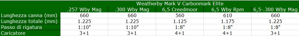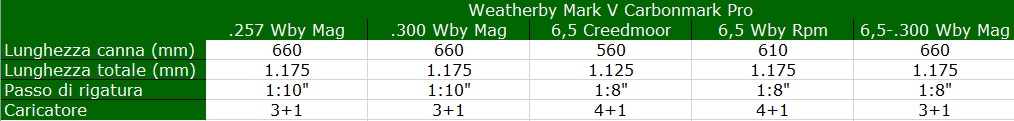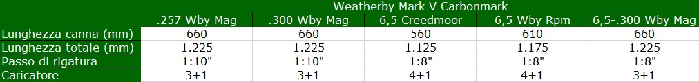 La Weatherby Mark V Carbonmark è disponibile nei calibri .257 Weatherby Magnum, .300 Weatherby Magnum, 6,5-.300 Weatherby, anche per mancini, e poi 6,5 Creedmoor e 6,5 Weatherby RPM.
