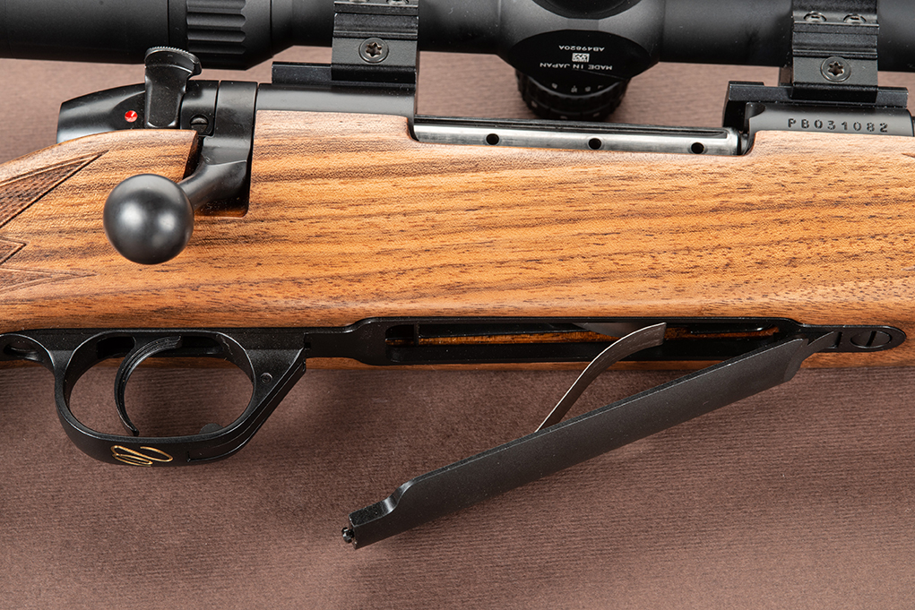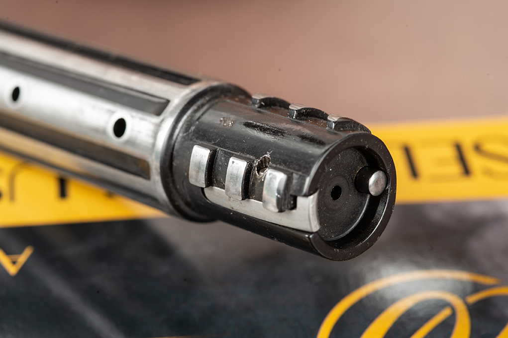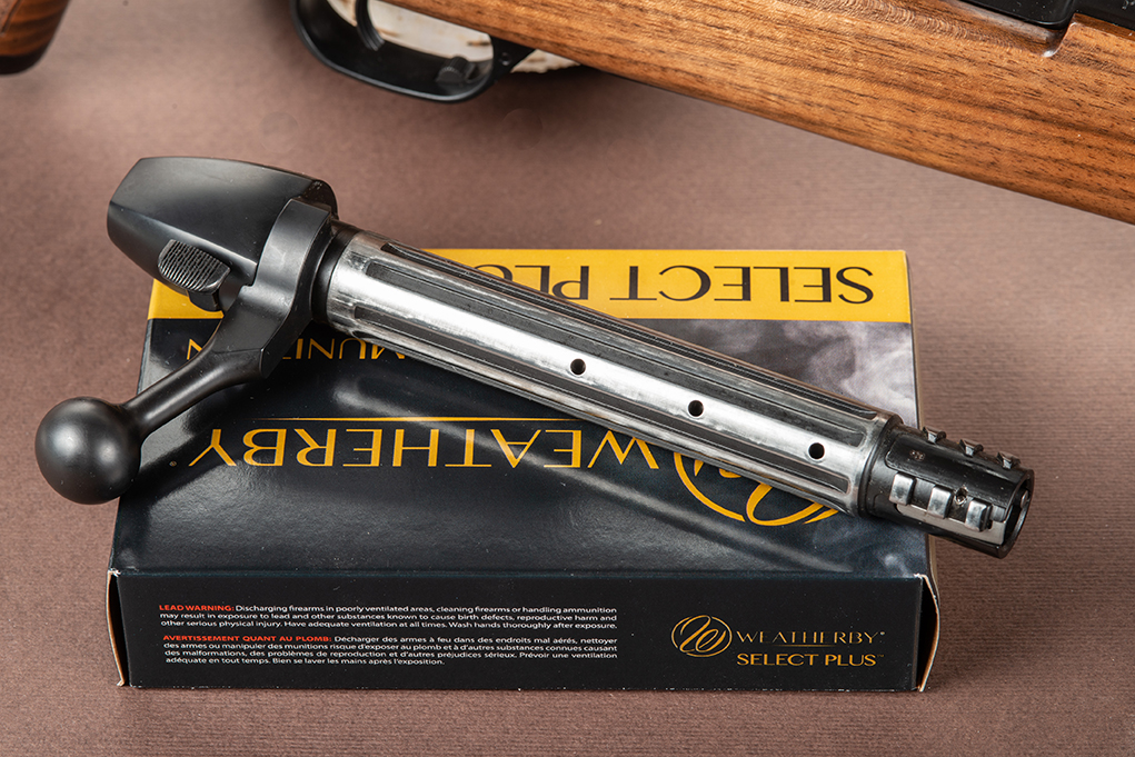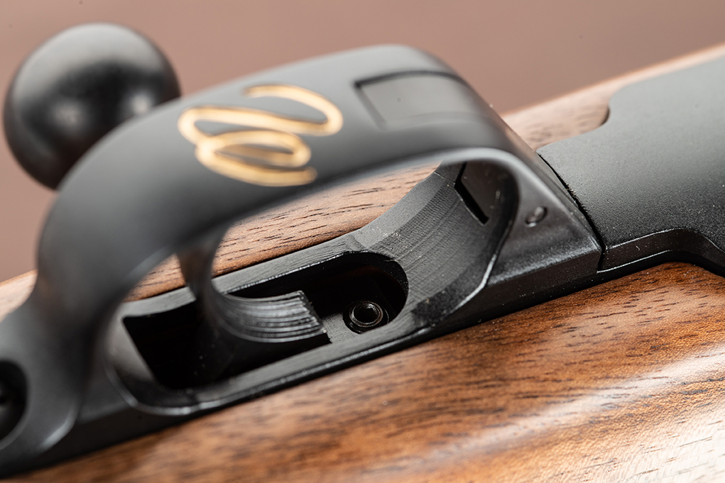 Cuore del sistema è l’azione con il suo bellissimo otturatore. Come da tradizione, nel nostro esemplare in .270 Weatherby Magnum dispone di nove alette che vanno a impegnare la culatta con un legame pressoché inscindibile; è presente un ulteriore anello di tenuta che va a sigillare l’area nel caso del perforamento di un innesco o della rottura del fondello. Sull’otturatore sono presenti tre fori che permettono la dispersione in condizione di sicurezza degli eventuali gas che dovessero infiltrarsi nel canale destinato allo scorrimento del percussore. Il tutto non inficia il disegno del componente: è in acciaio lucidato e presenta delle fresature di alleggerimento che ne facilitano lo scorrimento. Il manubrio dell’otturatore è piuttosto diritto e sporgente e ne consente il disimpegno per effettuare la ripetizione manuale con una rotazione ridotta a 54°.