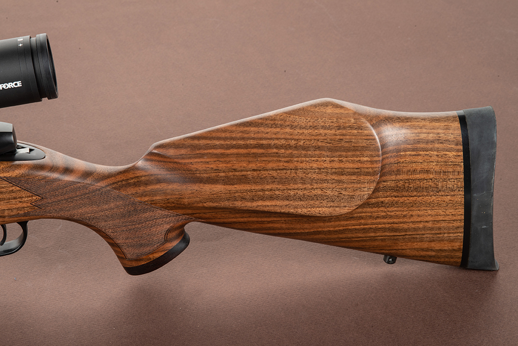 Della calciatura si è già accennato. È realizzata in noce e, nonostante la semplicità dell’allestimento, è presente un puntale in ebano, molto ben raccordato all’astina piatta, e nella pregiata essenza è realizzata la coccia. Molto fine e ben eseguita la zigrinatura nelle zone di presa. La pala del calcio termina con un calciolo Pachmayr Decelerator che contribuisce con efficacia ad attutire il colpo inferto dal rinculo.