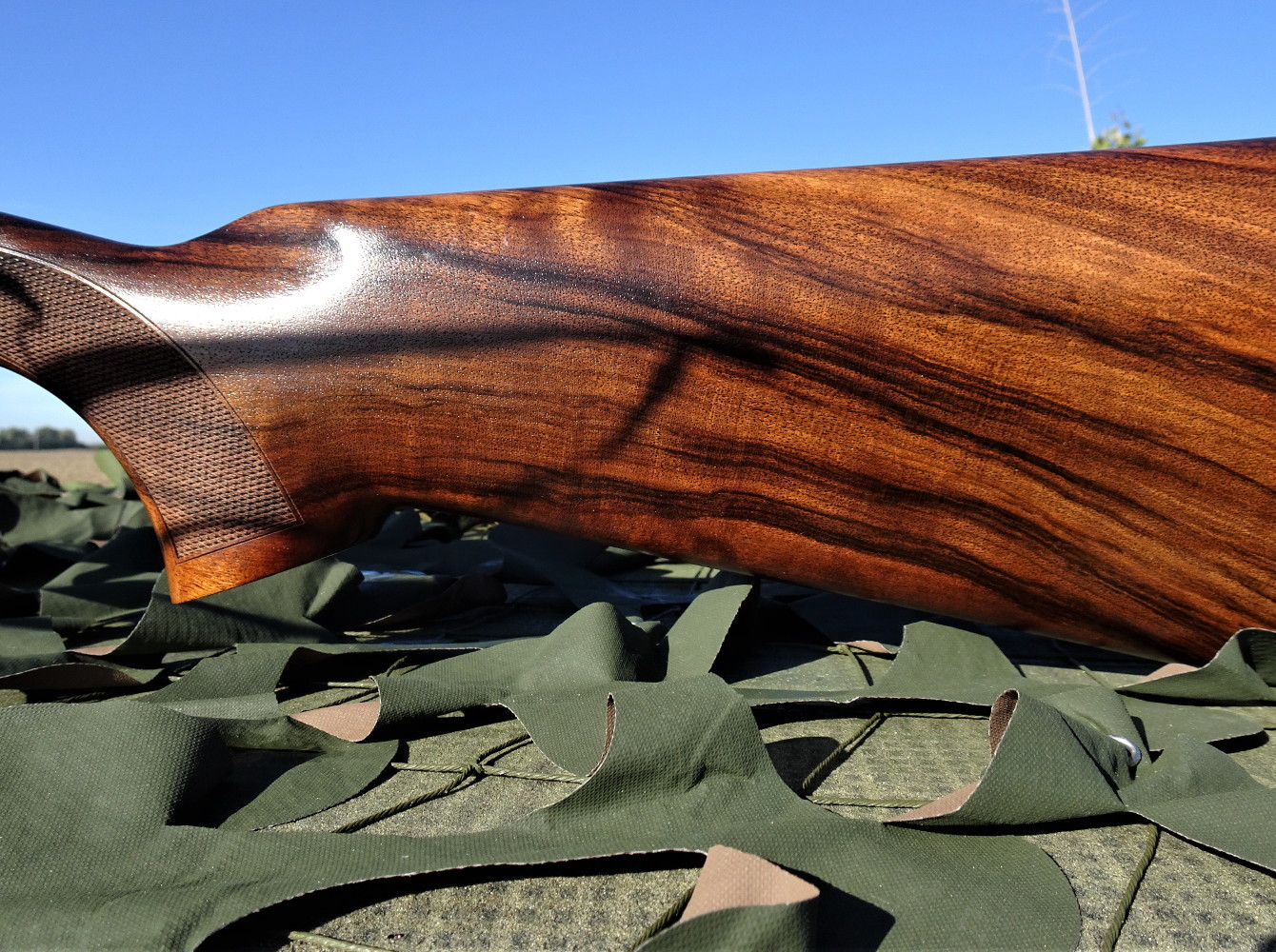 - Calciatura: in legno di noce turco di piacevole gradazione; calciolo in bachelite; astina a becco d’anatra con sgancio ad auget