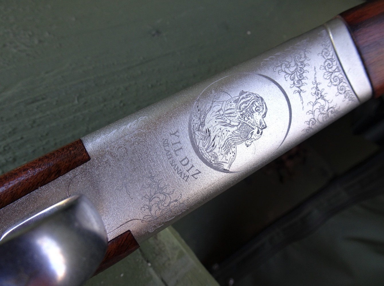 L’Yildiz Spz-M calibro 36 magnum si fa apprezzare per le sue forme minute ma non esageratamente ridotte e per il suo peso contenuto. Come per i fratelli maggiori, la bascula in Ergal 7075 è incisa a laser con soggetti venatori; le starne in volo raffigurate sui due lati di bascula lasciano qualche dubbio sulla reale destinazione d’uso, ma non fanno gridare allo scandalo in quanto a qualità. Sul petto di bascula è invece raffigurato un cane con in bocca un maschio di starna; l’incisore si è un poco lasciato prendere la mano nell’espressione spiritata. Completano il tutto alcuni decori ornamentali sotto forma di gradevoli fregi sparsi qua e là e le solite scritte che indicano il nome del produttore.