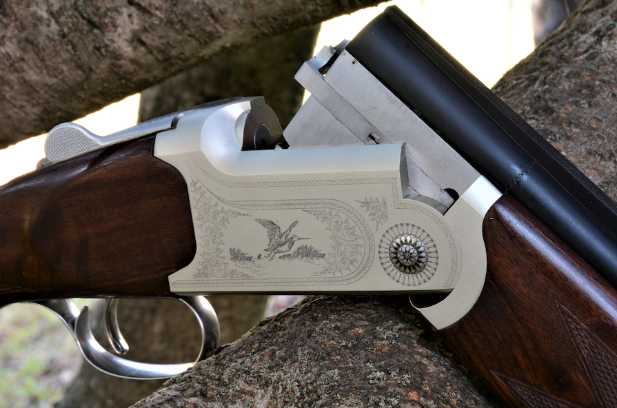 La bascula in ergal 7075 di tipo aeronautico ha una finitura nichelata (ma l’offerta si sta ampliando grazie alle versioni con bascula black, anodizzata nera), sulla quale compare un’incisione essenziale, crediamo rullata. Il soggetto sul lato destro e sinistro di bascula è un beccaccino in volo su ambiente paludoso. Alcuni ghirigori e volute ornamentali vanno a circoscrivere la scena di caccia, mentre un bordino tipo greca contorna gli estremi della porzione metallica.