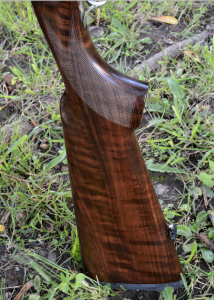 Inoltre l’astina, altrettanto gradevole, presenta una forma a becco d’oca idonea e vezzosa su un fucile dalle minute forme quale questo calibro 28, in grado di ingentilire sempre un’arma, specialmente se da caccia. Lo sgancio dell’astina è affidato a un comando ad auget di forma tradizionale e non inciso, ma più bello da vedere che non uno sgancio a pompa.