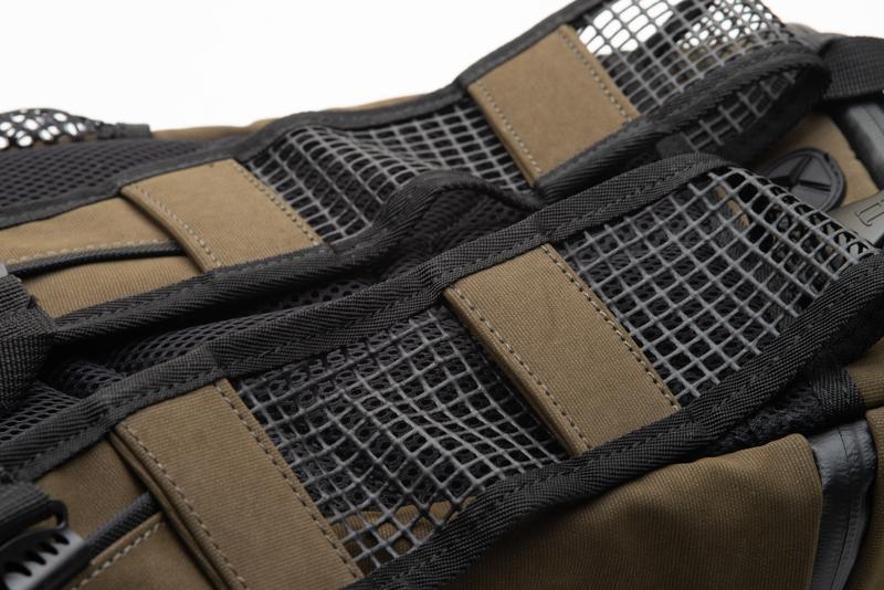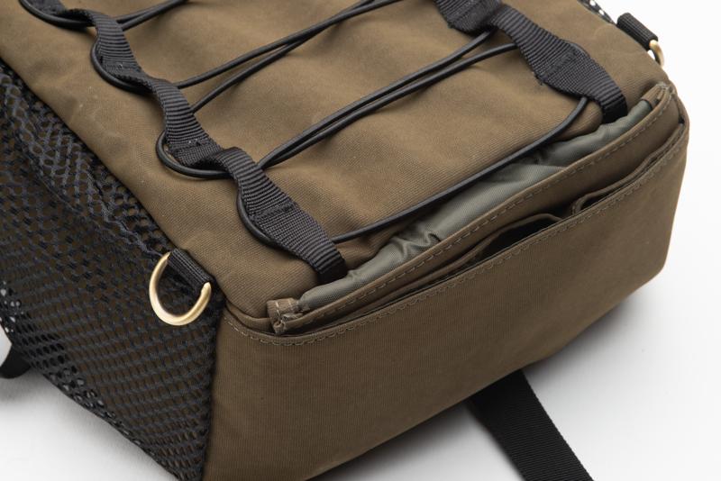 Oltre al vano centrale, accessibile dal cappuccio superiore chiuso da una zip su tre lati, lo zaino dispone di due tasche esterne aperte traforate e altre due tasche strette e lunghe, di non facilissima accessibilità, chiuse da altrettante zip. Sulla parte anteriore è presente una corda elastica incrociata che favorisce il trasporto di oggetti leggeri ma ingombranti, come eventuali capi di abbigliamento supplementari.